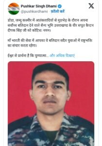 आतंकवादियों से मुठभेड़ के दौरान अपना सर्वोच्च बलिदान देने वाले सैन्य भूमि उत्तराखण्ड के वीर सपूत कैप्टन दीपक सिंह जी को कोटिशः नमन: धामी