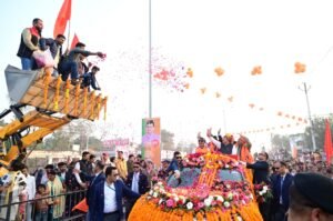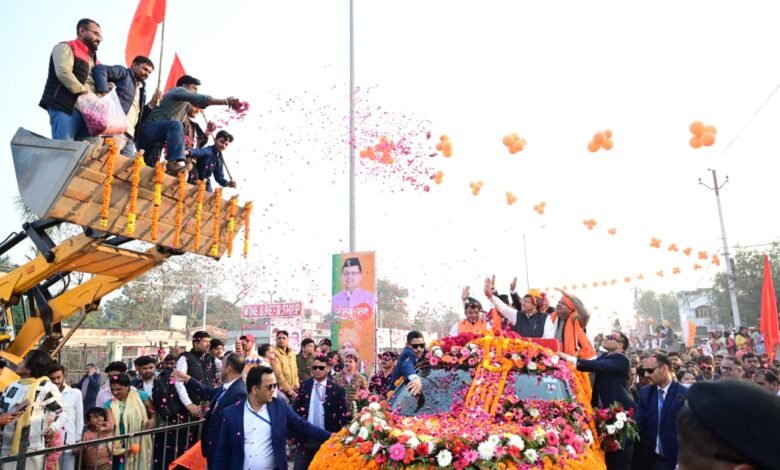 मुख्यमंत्री धामी के स्वागत में जेसीबी से हुई पुष्पवर्षा, ‘हर-हर महादेव’ के जयकारों से गूंजा पूरा शहर
