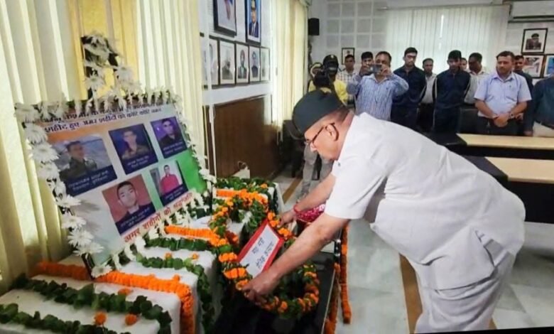 आतंकवादी हमले में पांचों अमर शहीदों के श्रद्धांजलि देते सैनिक कल्याण मंत्री गणेश जोशी.