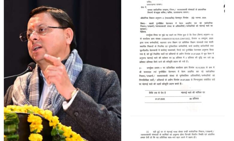 देहरादून। मुख्यमंत्री पुष्कर सिंह धामी के नेतृत्व में राज्य सरकार ने कर्मचारियों को बड़ी राहत देते हुए महंगाई भत्ते (DA) में 3 प्रतिशत की वृद्धि को मंजूरी दे दी है। धामी सरकार लगातार कर्मचारियों के हितों के प्रति गंभीर रही है, और उसी क्रम में सातवें पुनरीक्षित वेतनमान में वेतन आहरित कर रहे सार्वजनिक निकायों, उपक्रमों व स्वायत्तशासी संस्थाओं के अधिकारियों–कर्मचारियों के लिए DA को 55% से बढ़ाकर 58% किए जाने का निर्णय लिया गया है। नई दरें 1 जुलाई 2025 से लागू होंगी।