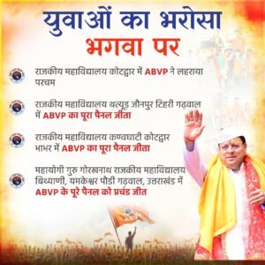 अखिल भारतीय विद्यार्थी परिषद (ABVP) को मिली बड़ी और ऐतिहासिक जीत ने स्पष्ट कर दिया कि प्रदेश के कॉलेज और विश्वविद्यालयों के छात्र, खासकर GenZ, भाजपा की विचारधारा और मुख्यमंत्री पुष्कर सिंह धामी के नेतृत्व वाली सरकार की नीतियों पर भरोसा रखते हैं। चुनाव परिणाम यह भी बताते हैं कि छात्रों के बीच सरकार के प्रति विश्वास की स्थिति विपक्ष के आरोपों से कहीं अलग है।